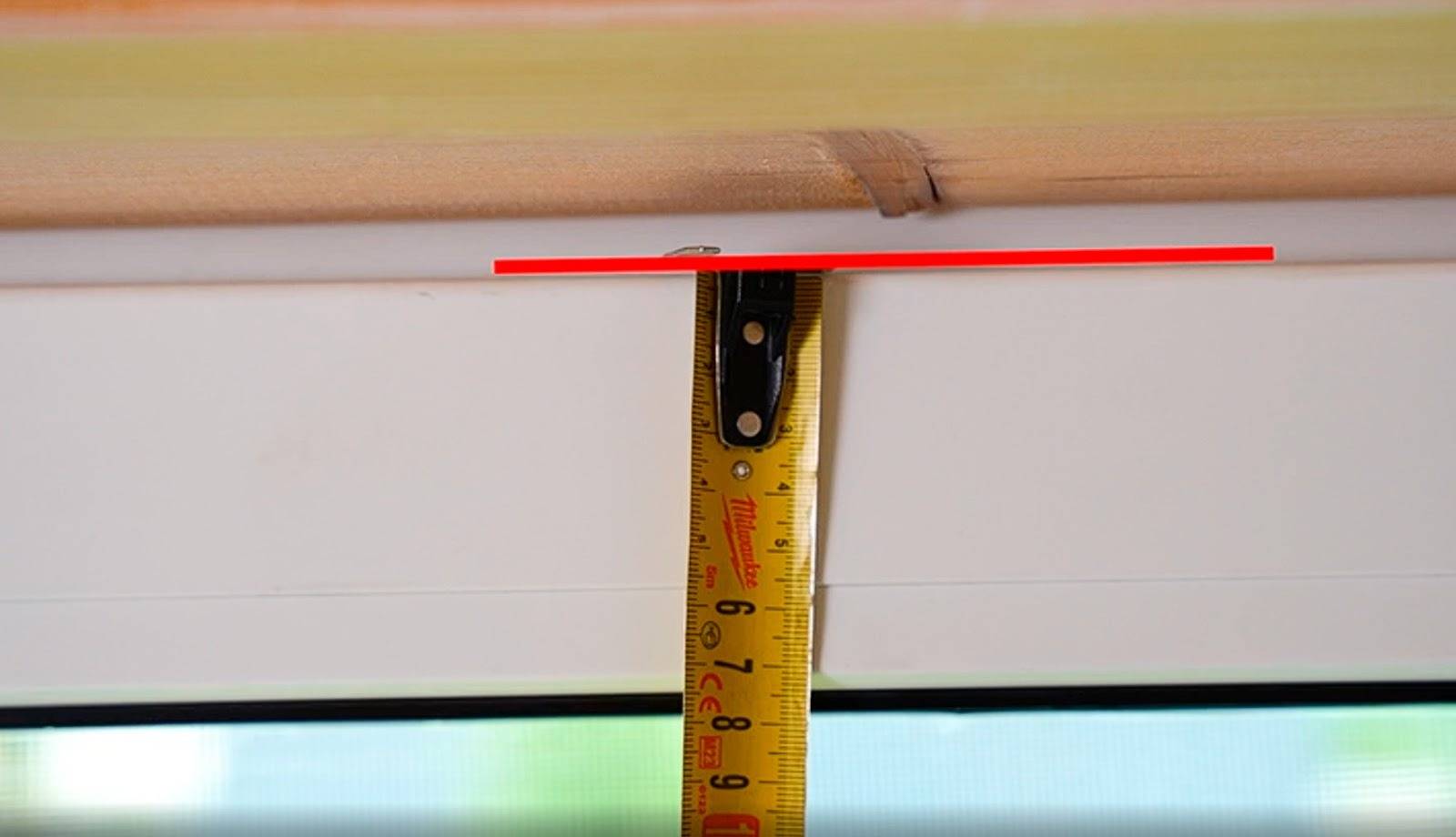 Короб будет крепиться по верхней части вровень с верхней частью створки. Выравниваем короб так, чтобы ткань по ширине равномерно закрывала световой проем окна. Карандашом помечаем желаемое место установки изделия.